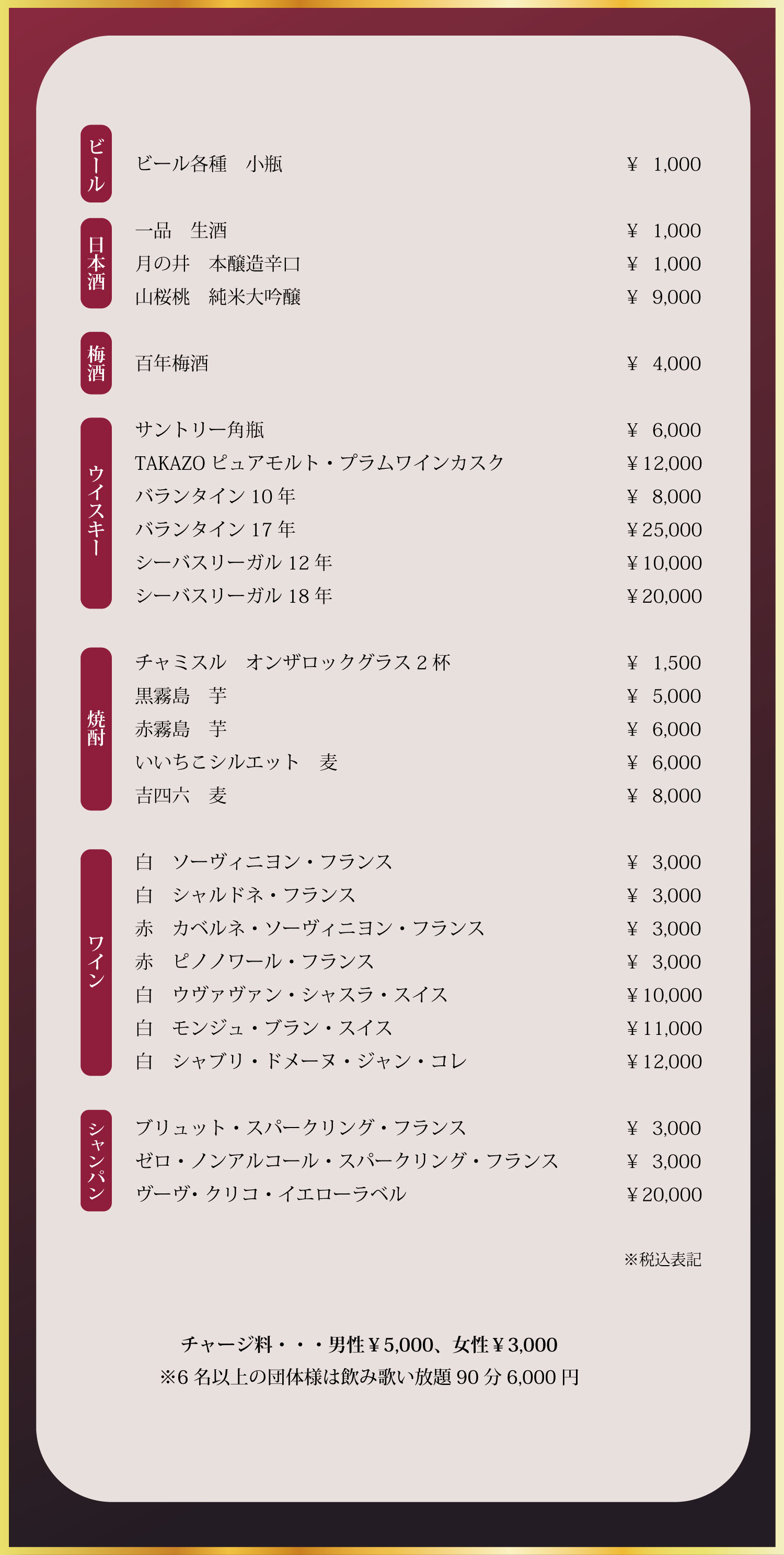 | チャージ料 | 男性5,000円 女性3,000円 ※団体様(6名以上)飲み・歌い放題 90分6,000円 |